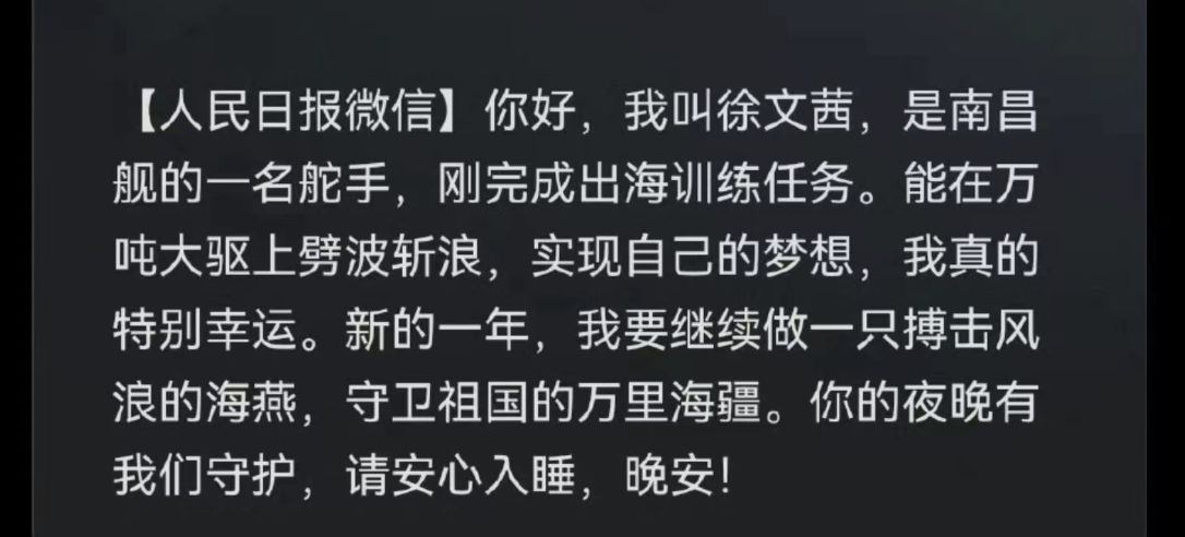 南昌舰90后女操舵手、英姿飒爽的女兵徐文茜的一条晚安问候也温暖了许多人。网友们在社交平台上,纷纷向这位素不相识的女战士问候一声晚安。“徐文茜,感谢有你,晚安!”“徐文茜,愿海风伴你入眠!”“徐文茜,感谢你深夜里带给我温暖!”……全网向徐文茜问候晚安,一时间成为一道美丽的网络风景。