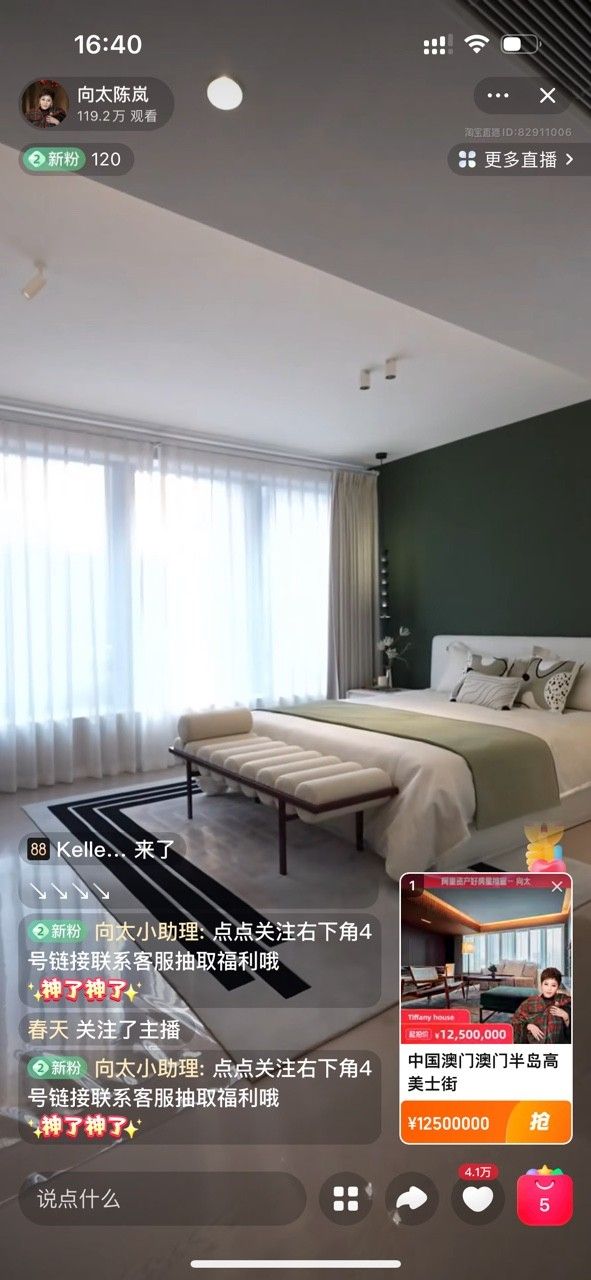 1月9日,阿里资产联合向太Tiffany陈岚开启了淘宝直播,带领大家深度体验了澳门“理想家”Tiffany house。论颜值,一见倾心再见倾情;论设计,前不见古人后不见来者。包括建筑立面、灯光、儿童公共空间等都拿过设计大奖,让人颇为震撼。此次直播中,网友们也见证了向太作为阿里资产全国首个房产星推官的加冕仪式。