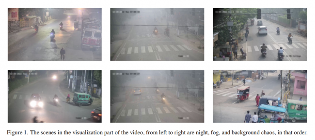 在不同的光照条件和摄像机角度下精确检测是否佩戴头盔是一项具有挑战性的任务。首先,在交通监控系统中,摄像头通常安装在相对较高的位置,导致视频分辨率较低。此外,如图1所示,光照、天气、模糊等因素也会增加识别的难度。为了克服这些复杂场景并提高模型的鲁棒性,我们采用了模型集成[4]的策略,详细内容将在第3.2节中进行描述。
