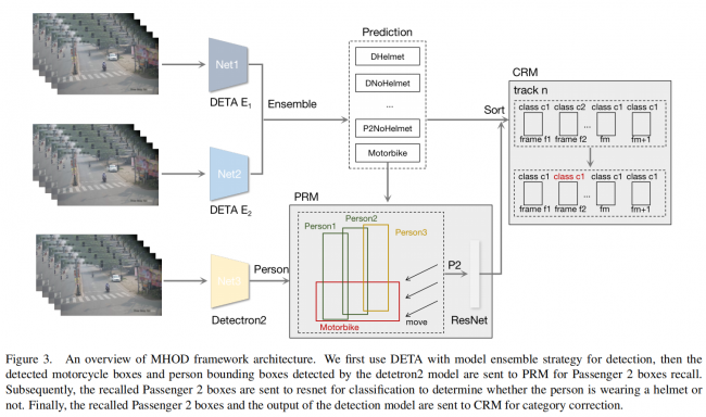 在本文中,我们提出了一种名为MHOD(Motorcycle Helmet Object Detection)的框架,旨在检测骑摩托车者是否正确佩戴头盔。MHOD模块利用目标检测网络来预测视频中所有目标的位置和类别。为了提高乘客类别的召回率,我们引入了乘客召回模块(PRM)进行跟踪细化,并通过类别细化模块(CRM)来校正目标的类别。PRM是一个可扩展的模块,主要针对Passenger 2进行召回,而未来可进一步发展适用于Passenger 1的策略,以提升框架的效果。我们在2023年AI City Challenge Track5的公共测试集上进行的实验表明,我们的方法取得了0.8340的分数,证明了该方法的有效性。