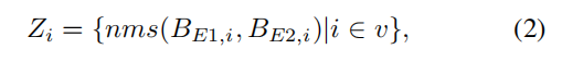 其中,bi是相应的边界框信息,fi是时间帧,v是视频的帧长度。在获取检测结果后,我们得到一个边界框b = (cls, xc, yc, w, h, s),其中cls是边界框的类别ID,(xc, yc)是中心点的位置,(w, h)是边界框的宽度和高度,s是置信度分数。我们进行非极大值抑制(nms)以过滤重叠的检测框,这些框可能涉及相同的对象。因此,通过使用nms从两个独立模型提取的最终预测通常被表述如下: