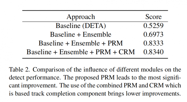 Table 2是消融实验的结果。集成模型会比DETA的基线高17.14%。PRM模块也会显著提升算法效果。此外,我们对训练集中的090.mp4进行了可视化,可以看到第12帧(图5a)中id为42的对象预测类别是DHelmet,但在的第24帧(图5b)中,它被预测为P1NoHelmet,使用CRM策略可以将该错误预测修正为DHelmet。
