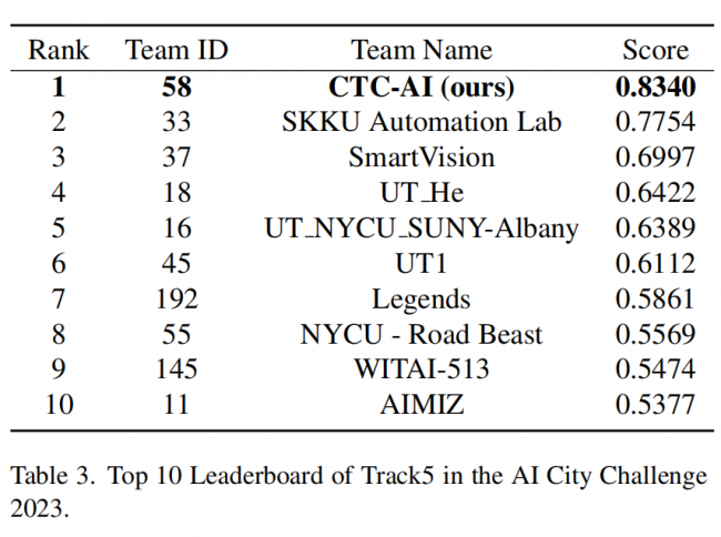 所提出的方法在AI City Challenge 2023的Track5验证集上进行评估。如表3所示,我们的方法取得0.8340的分数。