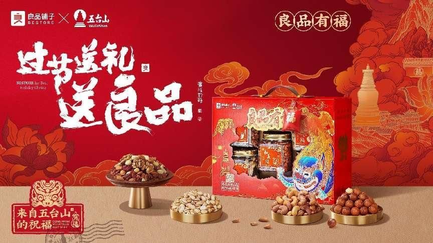 “良品有福”年货礼盒外观印有青狮、莲花、大白塔等代表福气祥瑞的五台山标志,寄托美好寓意,将“来自五台山的祝福”送入千家万户。礼盒分为“良品钰瑞礼”“良品颂福礼”“良品臻悦礼”三大主推款,每一款都主打高品质坚果并赋予了美好寓意。以“良品颂福礼”为例,内有紫衣腰果、澳洲夏威夷果、美国巴旦木、每日坚果、琥珀核桃仁五款爆款坚果产品,同时取坚果之谐音与特质,分别寓意鸿运福、成功福、和谐福、健康福、常青福。此外,再搭配买礼盒抽福卡活动,开门纳福、出门送福、职场派福、福气满满等来自五台山的“福气连连”福包,一举击中Z世代的喜好。