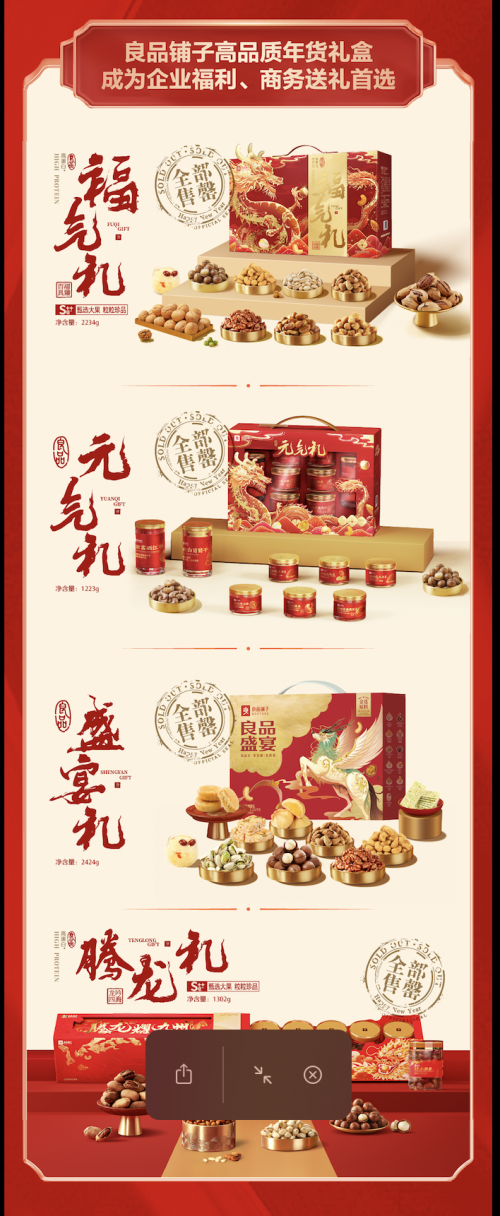 更有质价比的“品价优势”,互动性更强的春节营销,更有品质感和话题性的联名年货礼盒,是良品铺子本次年货季的制胜关键。