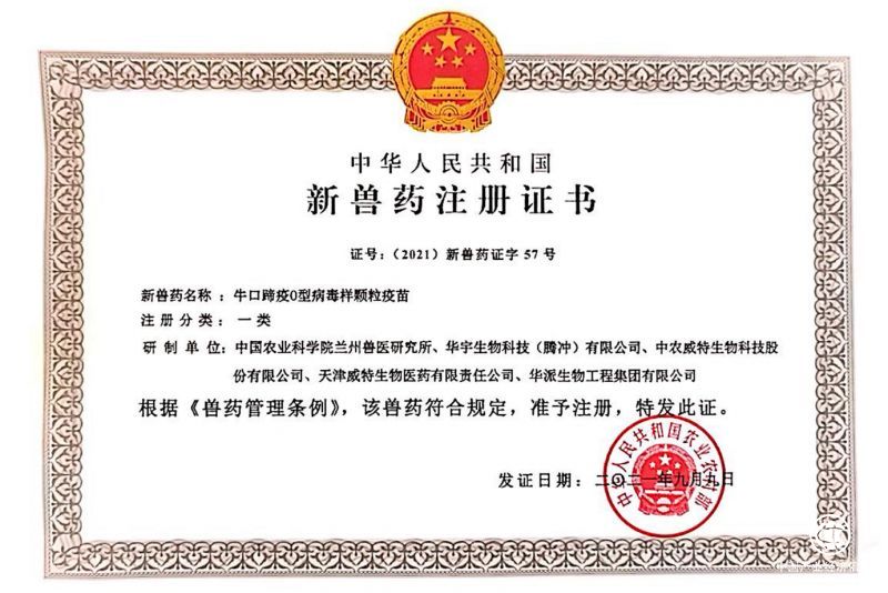 华派生物集团作为一家以创新驱动为内核的企业,在30年的发展历程中,始终践行“科技兴企、人才强企”战略,努力构建强而有力的科技创新体系。通过采取“自主+合作”的研发方式,华派生物集团开发出了填补世界空白的颠覆性产品——口蹄疫病毒样颗粒疫苗(VLPs),并且获得了猪的O型和牛的O型两个国家一类新兽药证书。