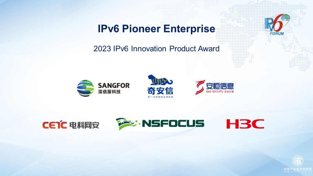 为表彰在多领域、多产业推进IPv6部署及应用方面做出积极贡献的企业,鼓励更多机构参与到IPv6创新发展和和部署应用中来。经过专业权威评审,2024年1月10日,全球IPv6论坛正式公布中国地区2023年度“IPv6 先锋企业”。 本次全球IPv6论坛IPv6先锋企业共设“IPv6支持度优秀奖”和“IPv6创新产品奖”两个奖项。天融信、奇安信、数字认证、吉大正元、三未信安、电科网安、新华三、迪普科技等23家企业荣获“2023 IPv6支持度优秀奖”,深信服、安恒信息、绿盟科技、奇安信等6家企业荣获“2023 IPv6创新产品奖”。
