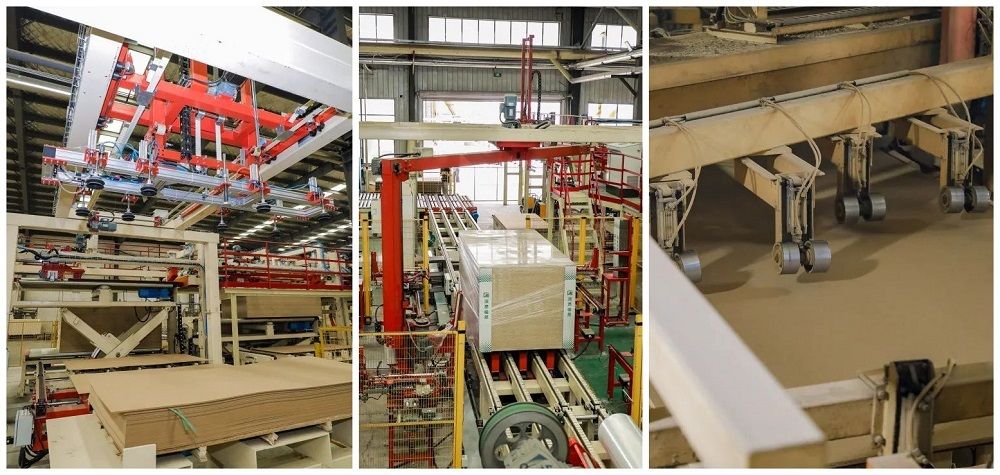 智能制造:工厂引进国内首条德国辛北尔康普完整生产线、德国帕尔曼长材刨片机、意大利意玛帕尔三层超级筛、表芯层气流风选机和国际先进的八尺连续压机等工业4.0设备,实现产品生产从制造走向「智造」。