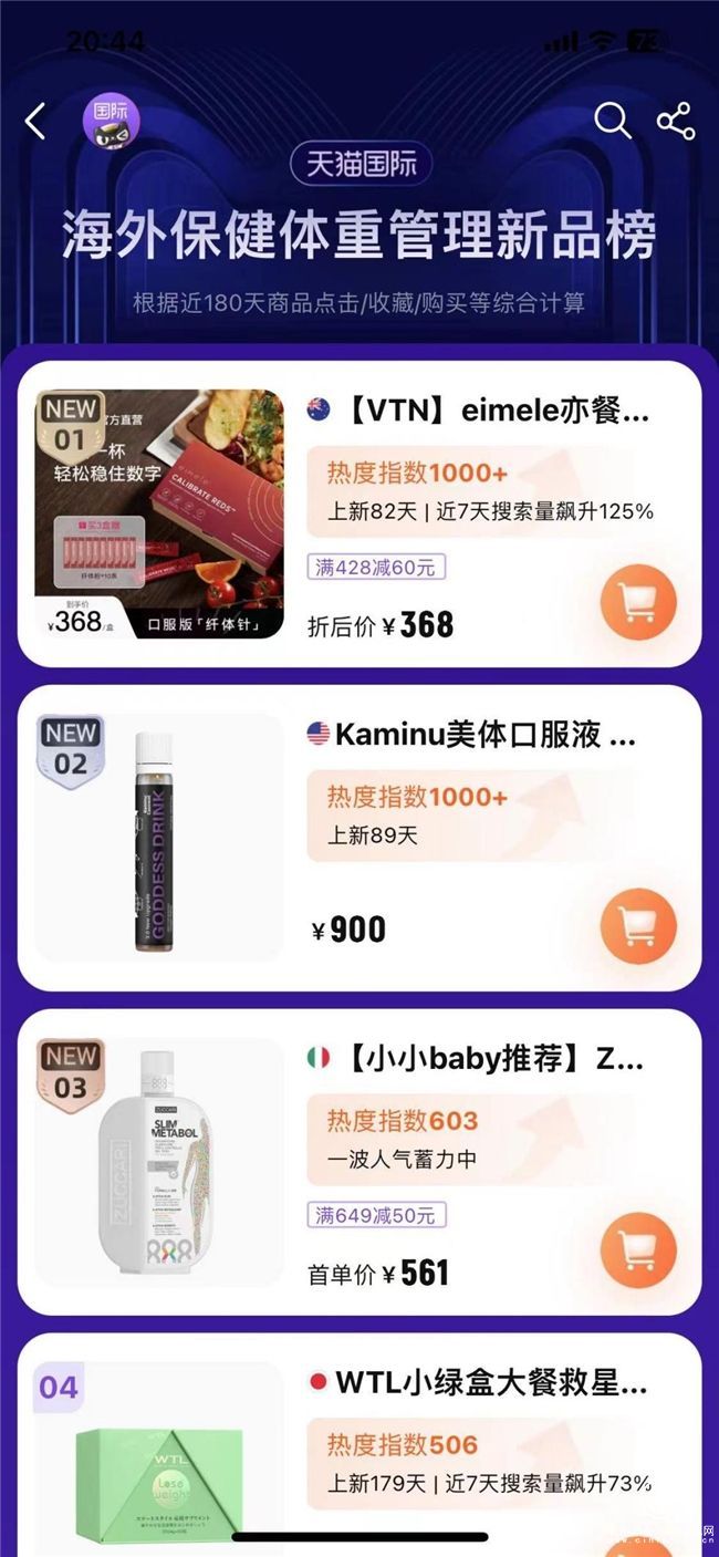 而在《经济观察报》发布的2023年度现象级消费爆品盘点中,一款名为“亦餐小红粉”(官方产品名亦餐口服纤体粉,也叫口服植物司美),主打“天然GLP-1”、“口服植物司美”概念的身材管理产品首次上榜。公开资料显示,该款产品由澳洲植物基营养品牌eimele亦餐推出,上市前已获得澳洲TGA(澳大利亚药物管理局)认证,亦餐纤体粉在天猫国际“海外保健体重管理新品榜”中排名TOP1。