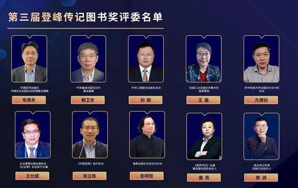 第三届登峰传记图书奖评委:中国经济出版社/中国石化出版社总经理兼总编辑毛增余、中央编译出版社社长兼总编辑郗卫东、中华工商联合出版社社长刘刚、机械工业出版社华章分社首席策划王磊、华中科技大学出版社大众分社社长亢博剑、企业管理出版社副社长/《企业家》杂志执行主编王仕斌、《中国民商》杂志执行社长张立栋、海南出版社北京分社社长彭明哲、《商界评论》主编/重庆盈科投资合伙人唐亮、商业传记作家/润商文化创始人陈润。