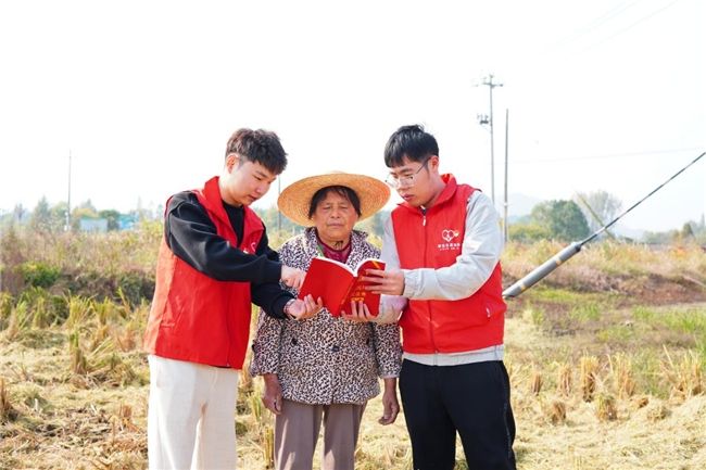 图为青年志愿者正在田间地头开展志愿普法。陈含芊摄