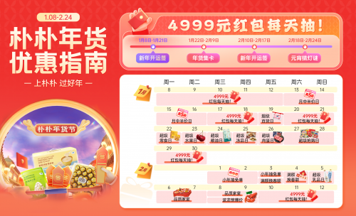 活动页面显示,1月8日到2月24日,朴朴超市每天均有大量红包送出,其中金额最高的4999元红包每天都有机会抢到,还可以福卡瓜分200万红包;2月3日至4日,下单满额换购礼盒的活动,礼盒内准备了精美春联、红包、窗花等春节饰品,为春节添一份吉祥喜庆;除此之外1月到2月还会不定期针对特定品类进行促销,用户可以根据不同需求,为新的一年“蹲点囤货”,享受更多折扣。