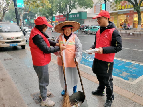 志愿者一早就到“香溢红色驿站”门口,为同样冒雨一早在户外辛勤劳动的环卫工人披上雨衣,并送上腊八粥。这一简单而贴心的举动带来了意外的惊喜与温暖。环卫工人张大妈激动地念叨:“有了这雨衣,不怕风也不怕雨,喝了腊八粥,身上温暖心里敞亮,扫地也不累了!”