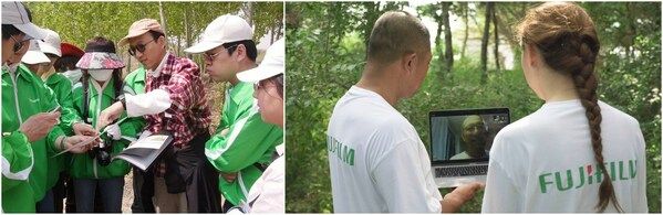 左图:大龙隆司在向志愿者介绍树苗的成长;右图:2023年活动中,大龙隆司与志愿者队连线交流
