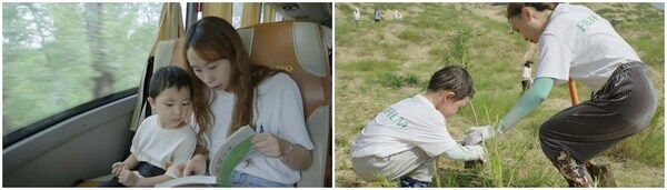 左图:富士胶片员工刘圣音在赴内蒙古植树旅途中和儿子阅读关于富士胶片参与该活动15周年的书籍《种树,改变了谁?》(2013年出版);右图:刘圣音和儿子在沙地植树