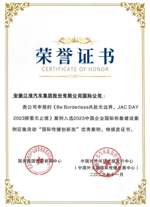 2023年11月27日,江汽集团与越南用户共创的《Be Borderless共赴无边界,JAC DAY 2023探索无止境》短视频故事,入选2023中国企业国际形象建设案例征集活动“国际传播创新类”优秀案例。