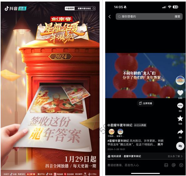 不管时代如何发展,只要文化之根仍深扎在这片广阔的中华大地,“年味”就不会消散。在即将“龙”重登场的新春佳节,抖音发起“星耀华夏年味纪”活动,重启记忆深处的那份“年味”,连结名人大咖与广大网友云端相聚,一起感受东西南北的故乡情,寻找散落在城市角落里的多彩年味。本活动由中国名酒剑南春独家冠名。
