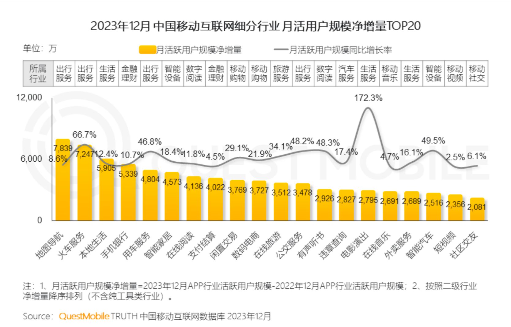 AI大模型的火爆,让智能化相关的应用也持续高增长,不仅诞生了文心一言、讯飞星火、豆包、通义千问等“消费级AI”应用,还出现了诸多“AI+”应用领域,如购物、办公、拍摄等。而兼具了智能化与线下场景的应用更加火爆,例如,智能汽车、智能配件、智能穿戴、智能家居,分别增速达到49.5%、49%、20%、18.4%,这几个典型行业用户规模也分别达到7601万、2277万、1.16亿、2.93亿。