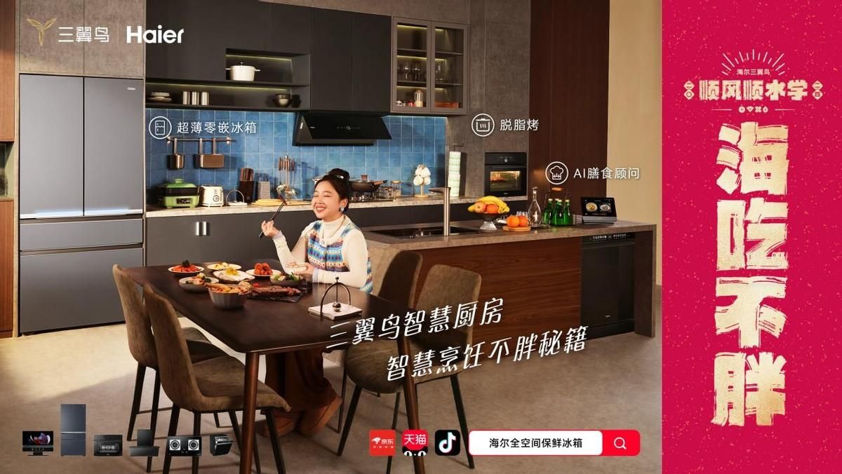 体重只能管住嘴?“食”全十美合家欢。在TVC海吃不胖篇中,女孩想在新年伊始既开启减肥大计,又不想错过老妈做的美味佳肴,于是祈祷自己变成海吃不胖的易瘦体质。而在海尔三翼鸟智慧厨房场景中,老妈为女孩找到了心愿满足的完美方式,从冰箱拿出新鲜的蔬菜与鸭肉,点开智家大脑屏AI膳食顾问,制定大师减脂餐后一键联动蒸烤箱烹饪,片刻之间就做出来了一顿健康吃不胖的美食。