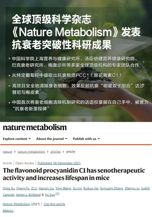 在抗衰老的前瞻性研究方面,除了发表NAD+与衰老的前瞻性研究成果《人血液中NAD+水平与衰老的关系》外,还在特定葡萄籽提取物中发现了突破性抗衰老物质——PCC1(原花青素C1),该研究并发布于全球顶级科学杂志《NatureMetabolism》。此外在糖尿病营养干预、益生菌菌株开发、血脂健康等领域,也取得了一系列领先的研究成果。