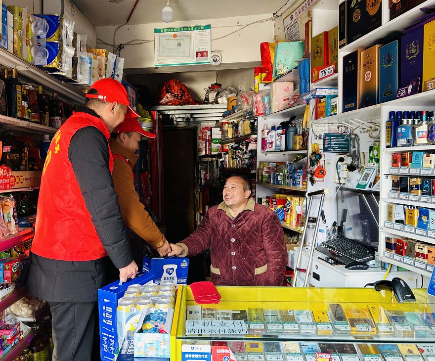 “王老板,春节即将来临,安全意识更要加强呀!”志愿服务队员张小飞一边说着一边帮助王老板检查着店内消防安全情况。