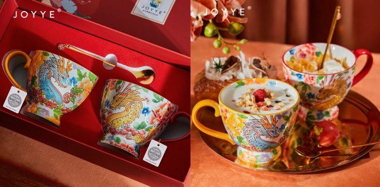展商JOYYE推出的龙年手绘马克杯礼盒,时尚、缤纷,完美融合国潮和现代风,如此高品质马克杯可以用于品鉴咖啡、茶,也可以作为酸奶杯。