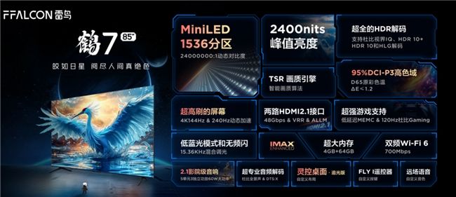 首先推出2024年的旗舰电视产品——鹤7 24款,这代表雷鸟首次跨入了千级分区电视行列。作为2024年的旗舰电视产品,鹤7 24款在MiniLED、背光分区和峰值亮度方面有不俗的表现。以85英寸为例,MiniLED1536分区,2400nits峰值亮度,搭载了TSR画质引擎,再辅之以超全的HDR解码能力,95%DCI-P3高色域,让画质呈现得更加淋漓尽致。更有低蓝光模式,还支持无频闪,15KHz的高频调光是无频闪认证标准的5倍,从产品配置就能看出雷鸟这次的诚意,硬件足够硬。鹤7 24款可以称得上是一款标志性的产品,标志着MiniLED技术的进一步下放,国产电视的硬件将越来越强。