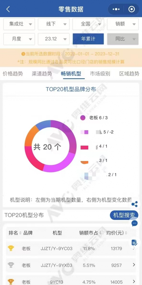 当下,厨电一体化、智能化的新趋势,让集成灶在市场受到热捧。据奥维云网2023年1月-2023年12月线下零售数据监测,老板全新一代高性能集成灶销额销量双料第一,整个2023年独占鳌头,备受行业瞩目。具体来看,在“集成灶畅销机型市占率TOP20”中,老板高性能集成灶9YC03、9YX03和9YC13霸榜前三,势不可挡。