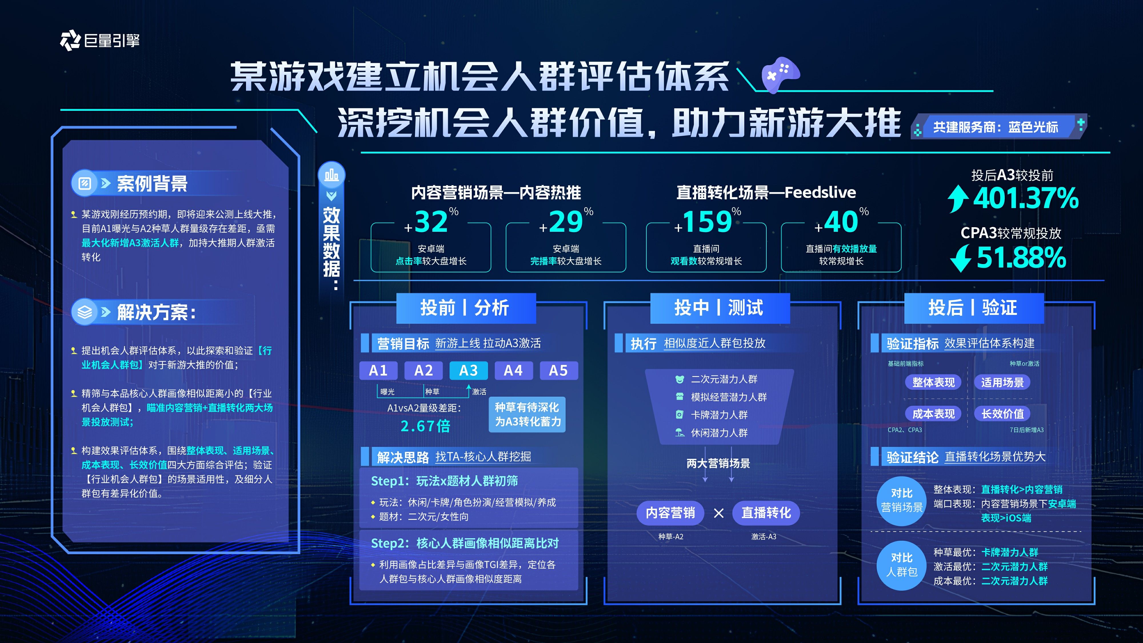 某游戏在预约期后即将公测上线之际,通过分析发现A1曝光与A2种草人群量级存在一定的差距,亟需最大化新增A3激活人群。游戏方通过巨量云图机会人群进行核心TA挖掘;并精筛与本游戏核心人群画像相似距离小的【行业机会人群包】,同时瞄准内容营销和直播转化两大场景进行投放测试,持续深化种草为A3转化蓄力;投后建立一套机会人群评估体系,验证了行业机会人群包对于新游大推的价值。最终A3量级较投前增加400%+,激活成本下降了一半。
