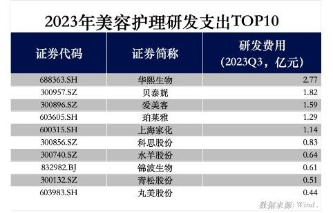 事实上,不论是研发投入的增速还是投入资金总额,华熙生物的研发力度都是头部队伍中的佼佼者。从财报数据来看,2021、2022年,以及2023年上半年,其研发费用分别为2.84亿、3.88亿,1.87亿元,与第二名相比,始终处于1.5倍以上的绝对优势。最新数据显示,华熙生物2023年前三季度研发支出达到2.77亿元,是国货美容护理领域中的第一,也是唯一超过2亿的企业。