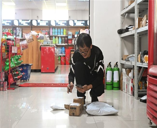 图为曹志友为顾客寄送快递。