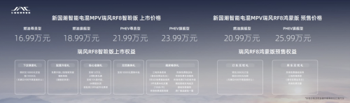 在发布现场瑞风RF8以16.99-23.99万元的售价区间,同步开启配置升级礼、贴心金融礼、无忧换购礼、阖家畅享礼等多重政策,预订用户同时叠加全部的预售与上市权益。此外,从即日起到3月31日,所有大定用户在享受预售价的基础上现金直减 8888元。除了正式上市的智聆版,瑞风RF8鸿蒙版同步启动预售,预售价格为20.99~25.99万元,即刻预订享受订车无忧礼、用车无忧礼两大权益,并将于4月开启交付。