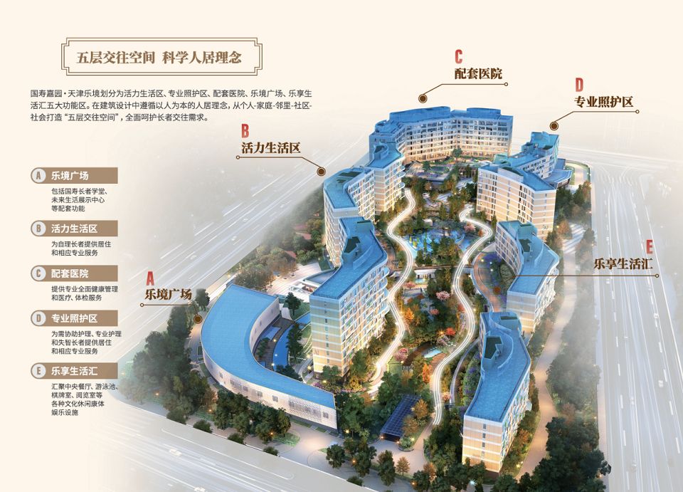 国寿嘉园·天津乐境作为中国人寿旗下医养结合型养老养生社区,位于天津空港经济开发区。社区占地面积7.4万平方米,容积率1.3,绿地率45%,划分为活力生活区、专业照护区、乐享生活汇、乐境广场、配套医院五大功能区,可满足千余名长者入住,提供活力养老、介助养老、专业照护和认知照护多模式养老服务。