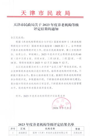 2024年2月2日,天津市民政局公布了《关于2023年度养老机构等级评定结果的通知》,国寿健投旗下医养结合型养老社区——国寿嘉园·天津乐境通过了500余项标准的专业评估,最终在60家养老机构中脱颖而出,成为唯一一家获评五级达标的养老机构。