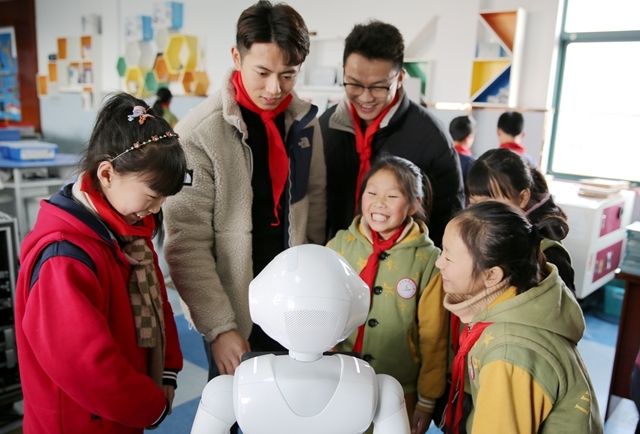 图为长兴烟草志愿者带领小学生们与机器人亲密互动