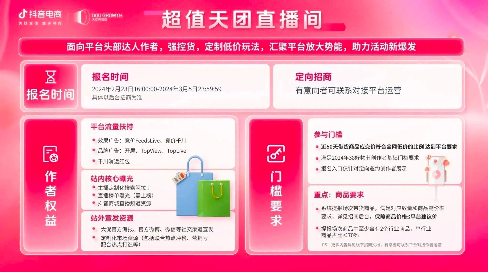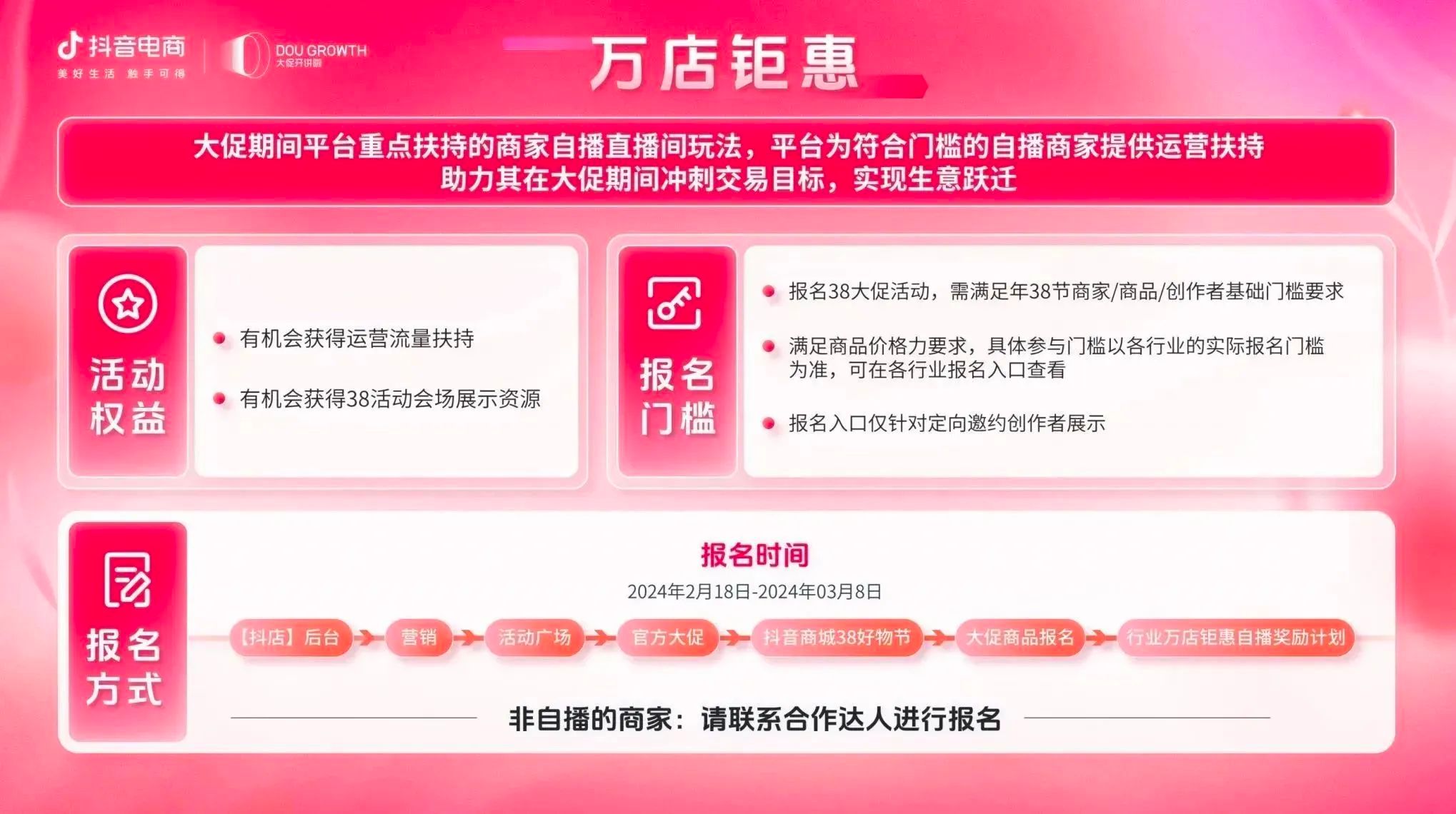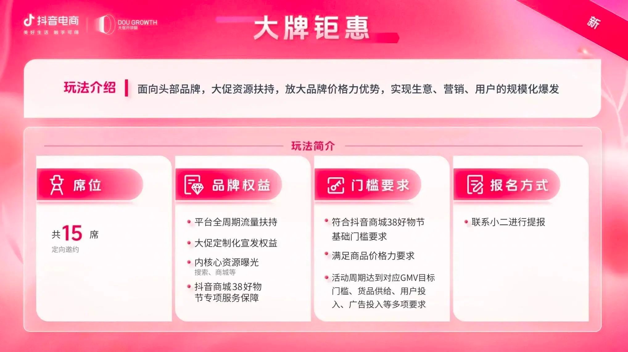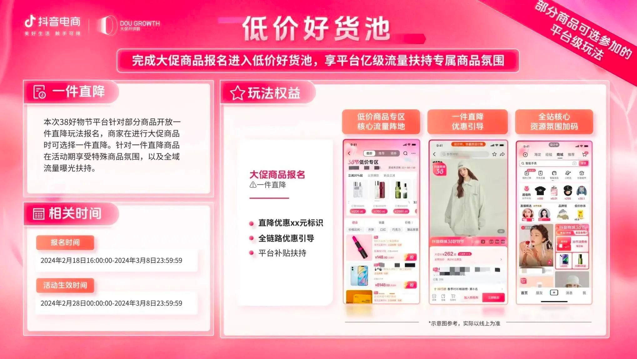 目前,抖音商城38好物节招商正在火热进行中,商家可关注微信公众号“抖音电商营销观察”获取活动报名手册,快速熟悉各项玩法,充分利用平台福利政策,获取更多高粘性精准人群,开启“她”生意新篇章。