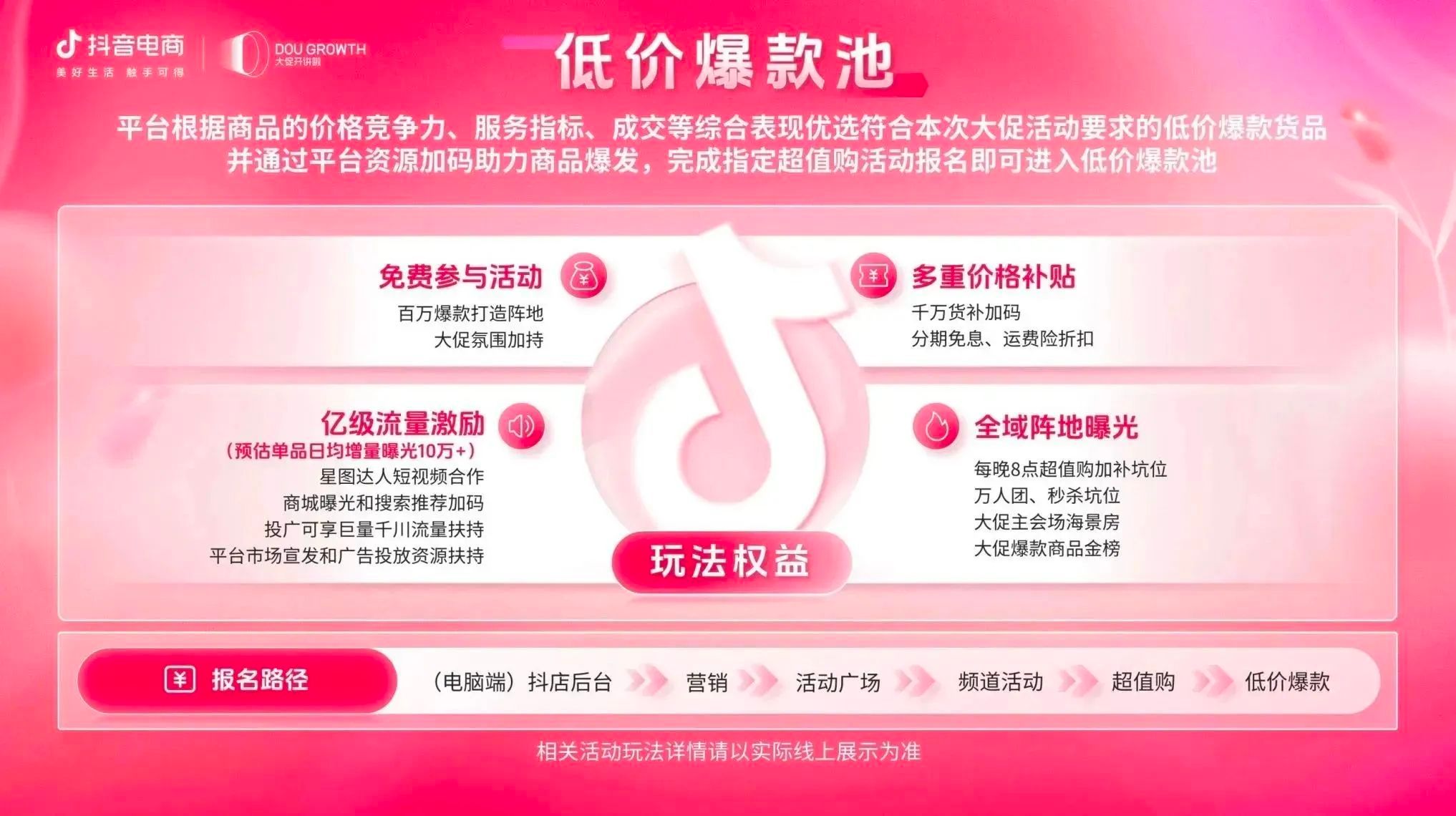 在「低价爆款池」玩法中,抖音电商将会为入选的低价爆款货品提供亿级流量激励和全域阵地曝光等资源,让低价好物被更多消费者看到。