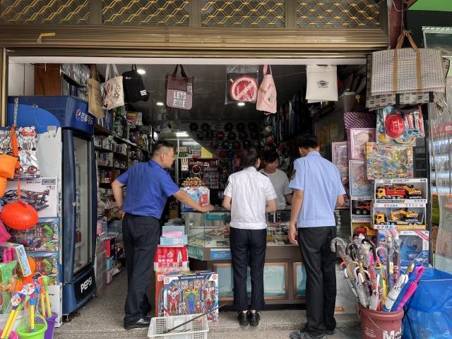 图为市场管理员联合其他单位开展校园周边检查。上官康/摄