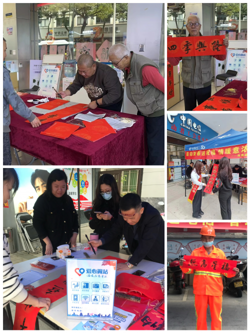 龙年伊始,万象更新,汕头电信珠池营业厅、世贸营业厅、红领巾营业厅、南门营业厅、后宅营业厅等多个爱心翼站站点同时开展富有传统新春文化气息的“泼墨挥毫送春联,平安添福带回家”活动。旨在与广大的户外劳动者、老年人共同庆祝佳节,为他们送上温暖的祝福。进一步弘扬中国的传统文化。