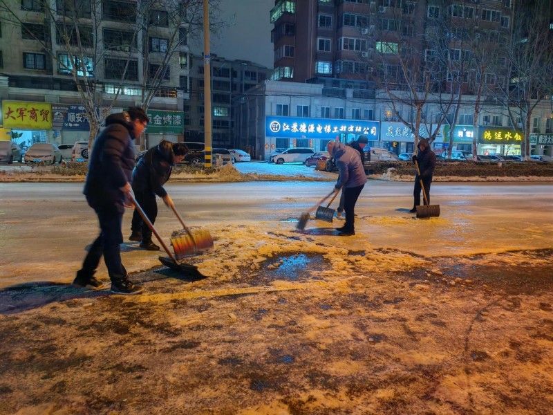 21日下午又突降暴雪,为有效利用此轮降雪停止后的时间,晚上八点,赣榆区局党支部立即组织党员走上包干路段,及时清理东关路至宁海路小学门前积雪。为快速保障道路畅通,提前撒播大量融雪剂,党员干部冲锋在前,群众主动参与扫雪、除冰、通路,万众一心,昼夜奋战,以“动”制“冻”,为学生开学、群众出行开辟了一条条安全通道。