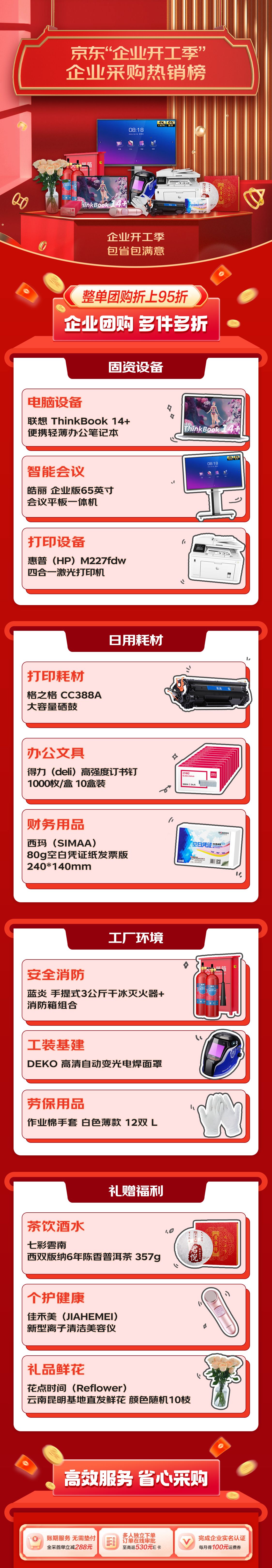 与此同时,京东企业业务还发布了“企业开工季”商品热销榜单。榜单显示,固资设备、日用耗材、工厂环境、礼赠福利成为企业开工采购的高频场景。京东企业业务将纷繁复杂的开工采购需求进行数字化拆解组合,构建出场景化的解决方案,从而大大提升采购人的选品决策效率。