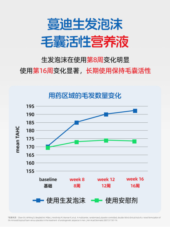优势四:渗透性强。蔓迪泡沫剂能够利用非传统的快速渗透途径来输送药物至毛囊中蓄积,其渗透的速度是传统剂型的五倍,泡沫剂快速累计药物于毛囊,药物累积量是其他载体的2倍以上。