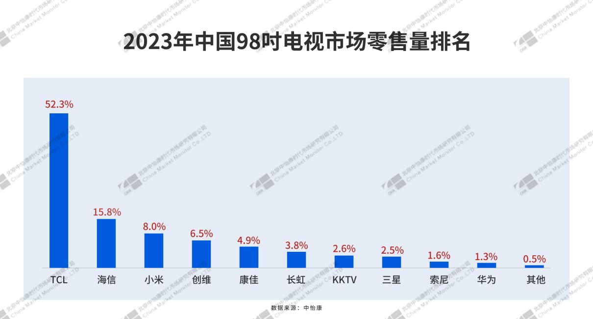 在Mini LED和超大屏电视市场,这三家中国品牌同样表现亮眼。据中怡康数据显示,2023年Mini LED电视中国市场零售量排名中,TCL以高达50.5%的市占水平稳居第一,海信与小米分别以21.2%和11.1%的市场份额,排名第二及第三。同时,2023年中国98吋电视市场零售量市场份额前三为TCL52.3%、海信15.8%、小米8%。