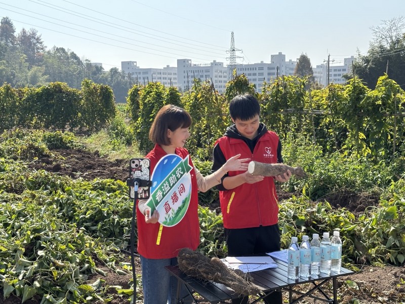 (图为“香溢”志愿队员在山药种植园进行助农直播。苏洋/摄)