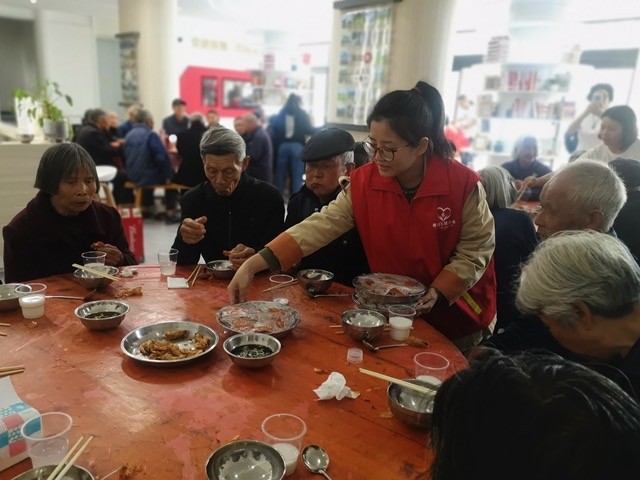 (图为“香溢”志愿队员为共宅村老人上菜。蔡文闽/摄)