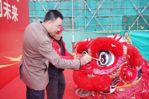 在封顶高潮时刻,舞狮队引领全场气氛达到巅峰,狮子跃上顶层,完成点睛之笔,象征着产业园项目的圆满成功和未来无限的发展潜力,更寄托了对材通(乐昌)产业园总部基地繁荣昌盛的美好祝愿。
