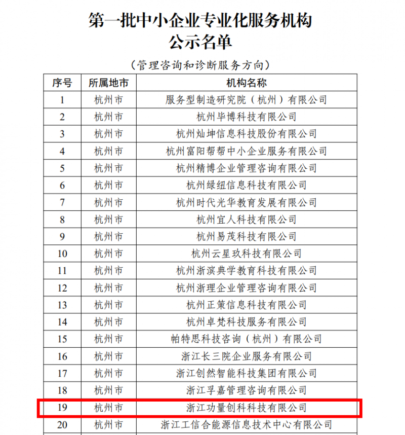 根据《浙江省经济和信息化厅关于开展第一批中小企业专业化服务机构征集遴选工作的通知》,经机构自主申报、省级初审、地市经信部门审核、省级复审、专家评审,2024年1月31日,浙江省经济和信息化厅公示了第一批中小企业专业化服务机构名单,浙江功量创科科技有限公司通过层层审核以及专家评审,成功入选浙江省第一批中小企业专业化服务机构。
