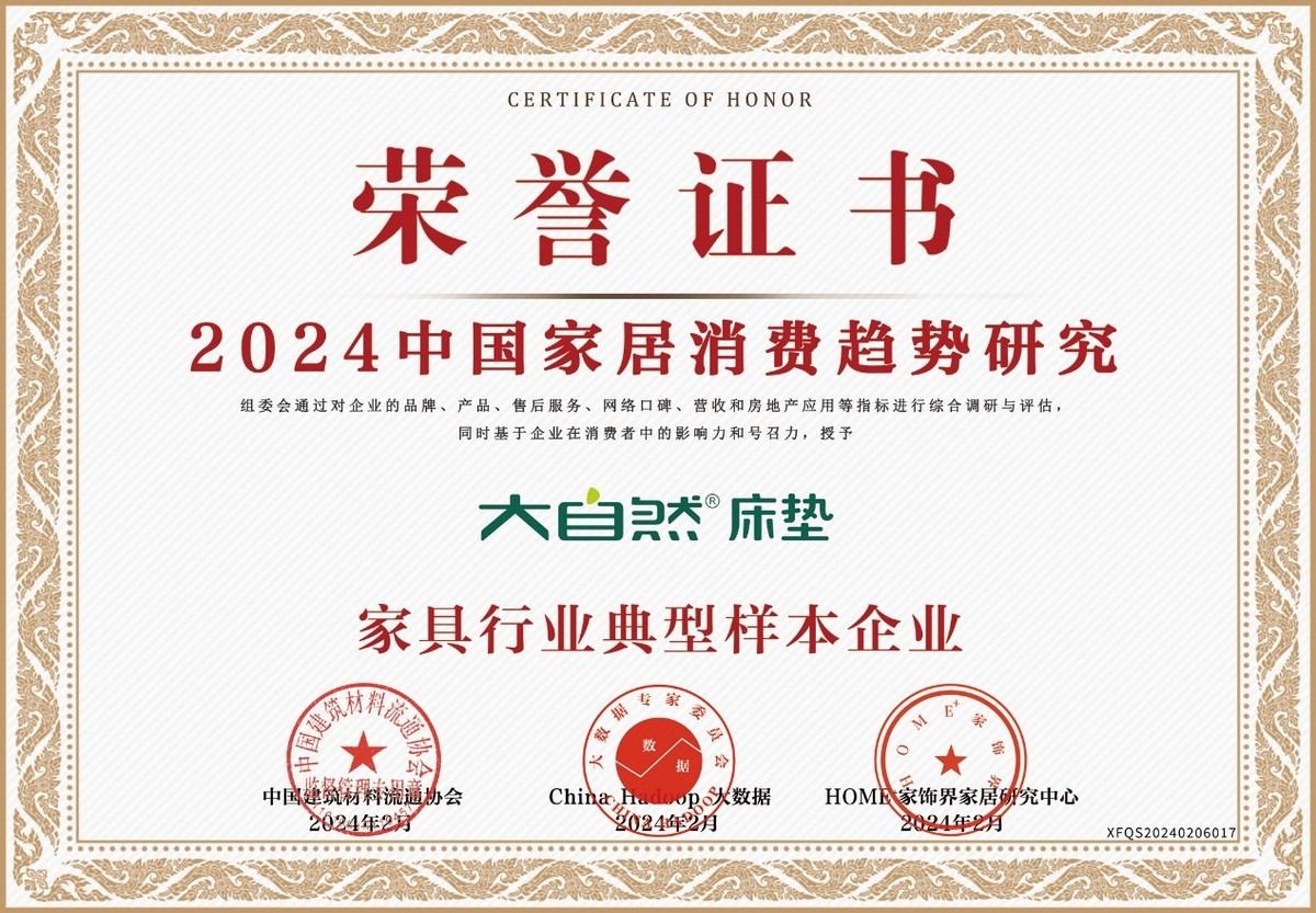 2月29日,被视为中国家居建材行业消费风向标的“2024中国家居消费趋势研究暨行业典型样本企业”发布,大自然床垫以卓越的品牌影响力和受消费者欢迎程度再次成为行业的焦点。连续第八年荣获“消费者喜爱的床垫品牌”殊荣,并再度入选“2024中国家居消费趋势研究家具行业典型样本企业”,这是对其在健康睡眠领域持续努力的肯定。