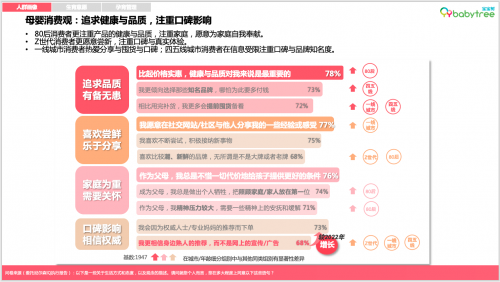 我国母婴人群的消费观根据不同年龄段也有所差异。报告涵盖了备孕人群、怀孕人群、0-12岁孩子的父母及丁克人群,其中备孕人群:他们更加注重健康和安全,对孕产期保健品的需求较大;怀孕人群:年轻化、高学历、职业女性为主,注重孕期营养和产后恢复;0-12岁孩子父母:收入稳定,注重孩子的教育、健康和安全,舍得投入;丁克人群:追求自由生活,注重自我实现,成为育儿市场的新生力量。