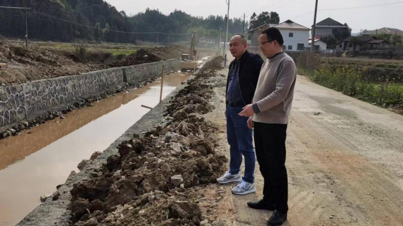 (刘家斌与驻村干部查看沟渠提质改造工程质量)